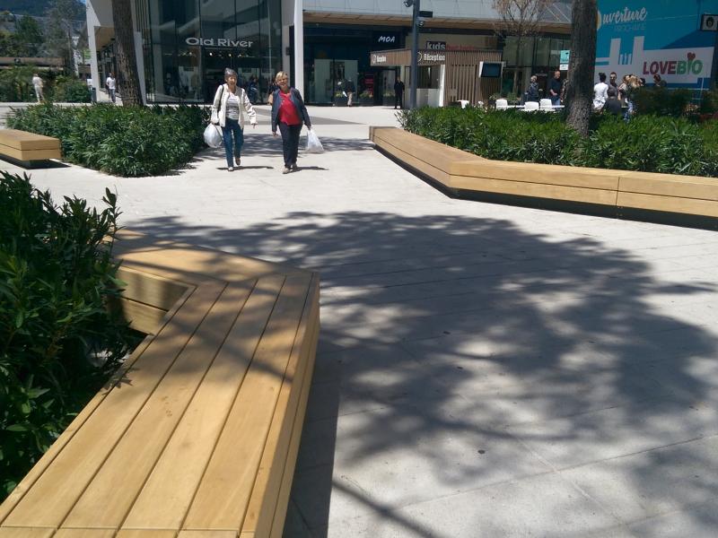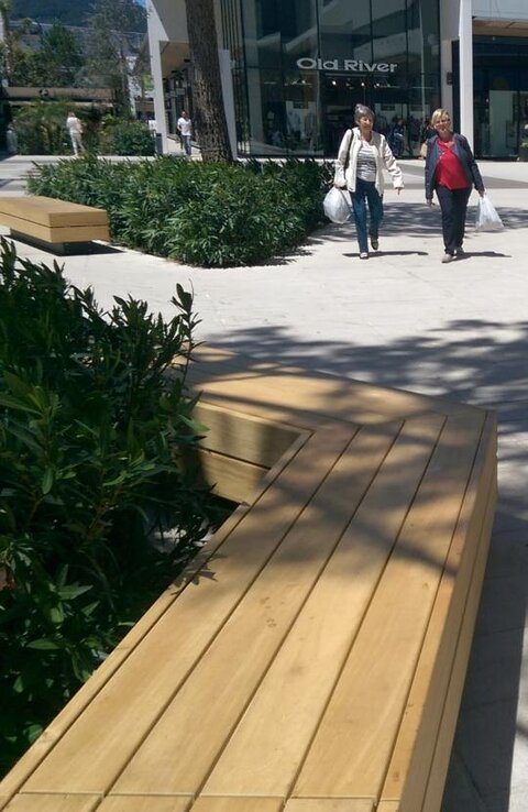 Banco lineal con asiento de madera certificado FSC ,marco de acero galvanizado y con recubrimiento en polvo. Además de los 3 modelos estándar (banco sin respaldo, con respaldo y respaldo doble), son posibles diferentes soluciones, por ej. grandes islas de sillas para sentarse y tumbonas, jardineras integradas o sentadas en diferentes niveles. ¡No hay límites para la diversidad!