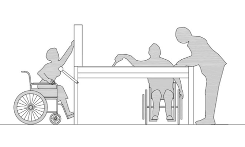Ayuda adicional para personas con discapacidad: crear una barandilla de apoyo / apoyo al trabajo de pie en la plataforma o en la mesa, se crea un punto de apoyo para el cuerpo, para las personas con parálisis en sillas de ruedas; lo que les permite hacer movimientos de las extremidades superiores.